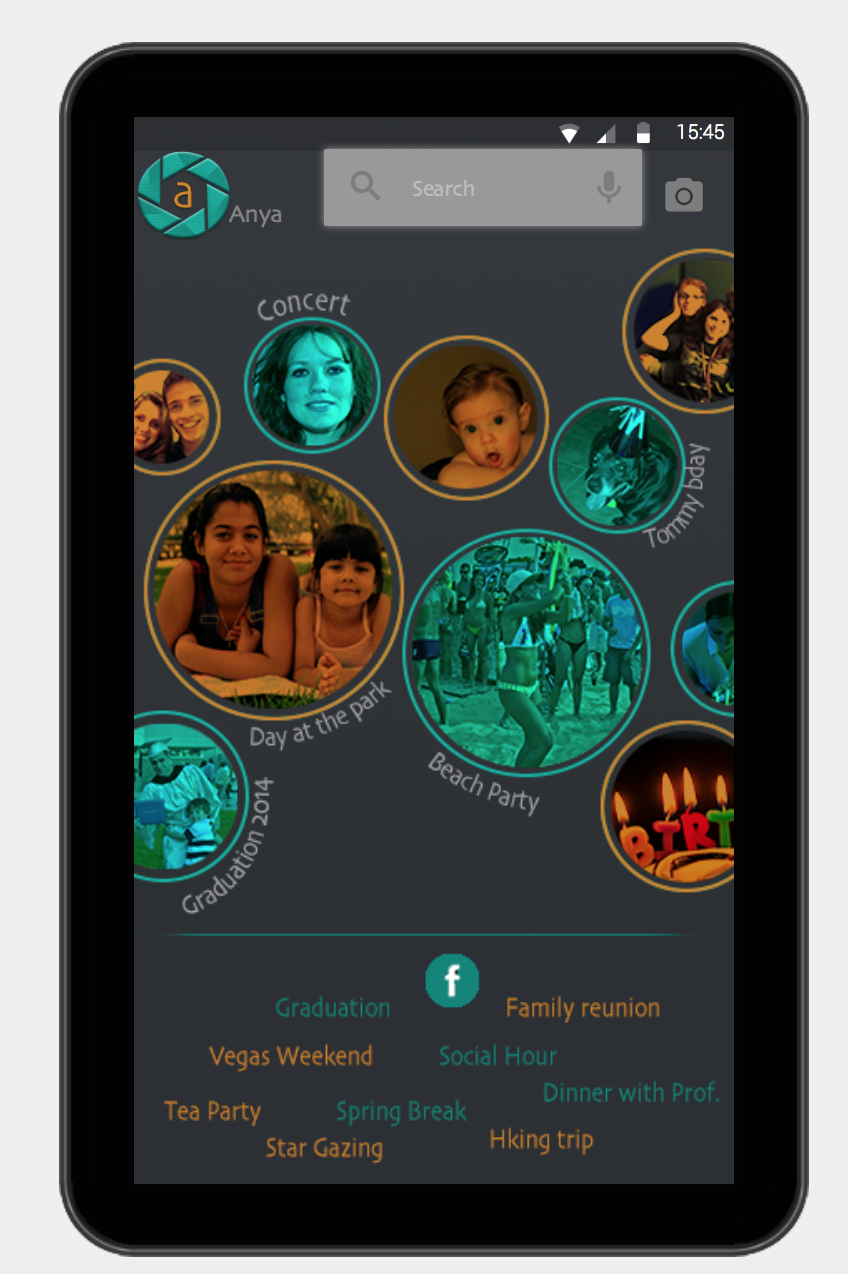 Finally, I designed a future UI theme for the application, with circles representing different events. These would flash different images belonging to the event like a slideshow. Different sizes of the spheres are according to the number of pictures in each event. At the bottom of the page, there are tags from pictures of the owner uploaded on Facebook by other people. Clicking on it would take them to the site.